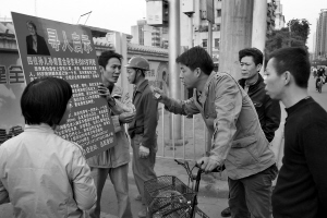 昨日,陳先生等四人在中山八路公交車站舉牌尋找走失的奶奶