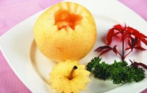2. 梨洗凈削皮,從蒂部往下1/3處打橫切開做蓋(有心思的話可切成鋸齒狀),挖去內(nèi)核;