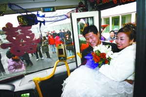 昨日,兩輛公交車成了一對新人的“重量級”婚車。新郎于浩是公交車司機(jī),新娘賈春穎是公交站調(diào)度員。新郎抱著新娘上車時,司機(jī)說“先生請刷卡”。