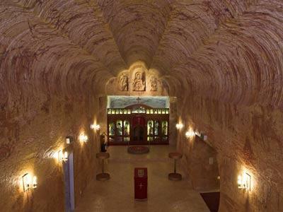 先從世界各地飛到澳大利亞悉尼,然后轉(zhuǎn)機(jī)到南部教會(huì)城市阿德萊德(Adelaide),在這里住宿一夜,補(bǔ)足精神后,第二天上午乘坐惟一一家經(jīng)營庫波佩迪航線的Kendell Holidays航空公司的小飛機(jī),在只有8個(gè)座位的單引擎飛機(jī)上度過難挨的3個(gè)小時(shí)——沒有空姐伺候,也沒有咖啡和紅酒,舷窗下面是一望無際的紅土沙漠,就在女孩子們即將花容失色的當(dāng)口兒,庫波佩迪到了。在高達(dá)40攝氏度的熱浪中坐上四驅(qū)車,沿途清一色的坑洞和起伏的的紅色沙丘,仿佛登上了土星,在這里首先要學(xué)會(huì)“黑白顛倒”,把白天當(dāng)夜晚,把夜晚當(dāng)白天。先從晚上開始吧,因?yàn)橥砩蠝囟炔拍芙迪聛,先去商店給情人挑選蛋白石,然后——庫波佩迪郊外有一個(gè)稱作“月球世界”(Moon Plain)的沙丘,是觀看南半球流星雨的最佳地點(diǎn),與情人摸黑來到這里,坐在柔軟的沙子上,老板會(huì)送上兩杯冰涼的澳洲利亞橙,然后透過高倍天文鏡了望星河閃爍的太空,在流星即將滑落的瞬間,擁緊你的情人許下星語心愿.....沙漠里的白天酷熱難當(dāng),最好呆在旅館里,而洞穴旅館恰恰是庫波佩迪的特色,情人們稱其為“洞房”——地地道道的“洞”。∈聦(shí)上,鎮(zhèn)上除了教堂和醫(yī)院,基本都是洞穴居所,這些大小不等的洞穴全部是開采蛋白石廢棄的礦坑。庫波佩迪最大的旅館“沙漠洞穴旅館”(Desert Cave Hotel)有20間“洞房”,別看在地下,卻相當(dāng)豪華,除了地下恒溫23攝氏度外,餐廳、酒吧、K房、珠寶店一應(yīng)俱全,曾經(jīng)入選過《世界頂級(jí)豪華小旅館》(Small Luxury Hotels of the World)。