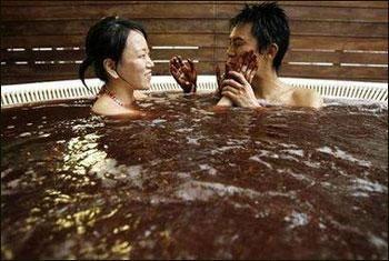 一對日本情侶在享受巧克力溫泉浴。