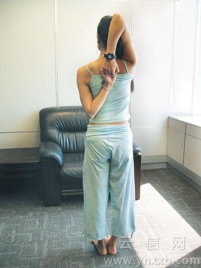 動(dòng)作要領(lǐng):站立或坐在椅子上,保持脊背直立,把右臂高舉過(guò)頭,彎曲右肘,試圖把右手放到兩肩胛骨之間。放下左臂,彎曲左肘,把左前臂收向背部,直到右手手指能和左手手指相扣。正常呼吸,保持姿勢(shì)5-20秒鐘,然后換方向重復(fù)動(dòng)作。別看很簡(jiǎn)單,做起來(lái)難度很大的哦!