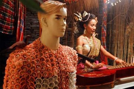 進(jìn)入餐廳的室內(nèi)區(qū),就像進(jìn)入安全套的博物館。墻壁上都是全球具有代表性的安全套產(chǎn)品的展覽,按照國別分裝在各自的格子里,不同的材料、顏色、形狀,漫步一圈能大致了解安全套的發(fā)展史。屋頂?shù)牡鯚粢惨园踩鬃鳛檠b飾,閃出不同顏色的光芒。餐桌設(shè)計(jì)也很獨(dú)特,桌面玻璃板的圖案是由安全套組合完成?繅Φ牟妥琅赃能欣賞到一幅幅被“加工”過的名畫,連舉世聞名的蒙娜麗莎也客串了一回安全套的宣傳大使,手中拿著安全套沖著客人微笑。