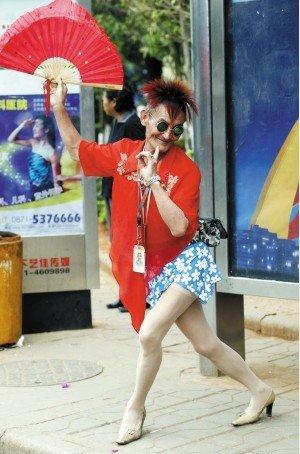 時(shí)髦的尖高跟鞋、絲襪、超短裙、艷麗的襯衫、酒紅色的“雞冠頭”……前天中午,在人流、車流如織的小菜園立交橋,這位時(shí)髦的“美女”大幅度搖擺著臀部,以妖艷的姿態(tài)橫掃著眾人的眼球。而當(dāng)看清“美女”的正面時(shí),大家的眼珠子差點(diǎn)掉了一地——原來(lái),這位“美女”竟是一位老倌。