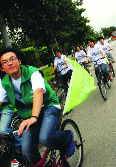 前天,100名大學(xué)生騎自行車?yán)@大學(xué)城宣傳環(huán)保。本報記者 馬強 攝