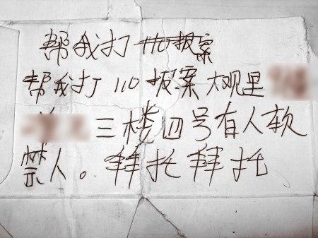 “幫我打110報案……有人軟禁人,拜托拜托。”昨日下午2點,家住成都大觀里某小區(qū)的一位大爺正在小區(qū)內(nèi)散步,突然,一張硬紙條歪歪扭扭地從三樓窗戶飄落下來,大爺拾起一看,大吃一驚,立即將紙條交給小區(qū)門衛(wèi)。5名警察接警后立即出動……