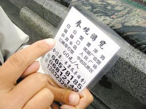 “一日游,60塊錢。馬上就可以走!币幻麐D女湊上來,還揚(yáng)起手中的一張紙片,上面印有參觀行程:白公館、渣滓洞、磁器口或湖廣會館、環(huán)游半島、人民廣場、三峽奇石館、華巖風(fēng)景區(qū)(含門票、車費(fèi)、導(dǎo)游費(fèi))。