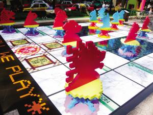 時代廣場外設(shè)置的“Shall we Play”巨型戶外斗獸棋可以滿足爸爸的童夢。