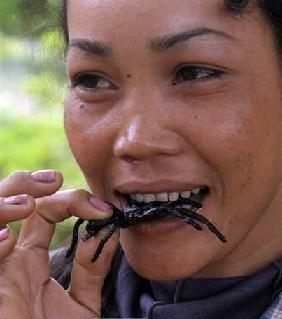 柬埔寨有種獨(dú)特的食物——油炸毒蜘蛛。這種蜘蛛主要產(chǎn)于中部的磅通省,以其肥碩、美味而著名。其他省份也有出產(chǎn),但比磅通的略遜一籌。毒蜘蛛不像我們常見的蜘蛛凌空結(jié)網(wǎng)而居,而是生長在地下,挖穴棲身,以吃草根果腹,抓它們要掘地三尺。每年4月中旬是毒蜘蛛最多最肥的時(shí)候,捕食蜘蛛當(dāng)以此時(shí)為佳。
