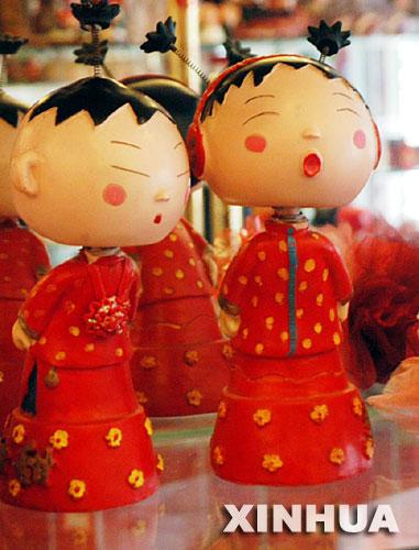 7月24日在蘇州一家商店拍攝的具有民族特色的情侶玩偶。