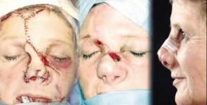 去年8月的一個深夜,她被一陣劇烈的咆哮聲吵醒,只見“奧利”正從床上跳下地面。普林塞斯回憶道:“我感覺一滴鮮血正從臉上滴下。由于疼痛難忍,我急忙下床沖進衛(wèi)生間照鏡子。我打開燈,簡直不敢辨認鏡中的那個人—— 一切就像恐怖片中的鏡頭!”原來,在普林塞斯的面部中央,鼻子不翼而飛,只留下兩個如同金魚眼睛般大小的洞穴。出奇冷靜的她一邊高聲喊醒大兒子卡奇呼叫救護車,一邊用一條沾了水的毛巾將面部緊緊裹住。