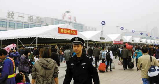 據(jù)廣州火車站站長尹鐘民測算,由于實名制多了一道驗證環(huán)節(jié),乘客進站時間或可增加到以前的幾倍,因此乘客候車區(qū)所需面積也將大大增加。為此,廣州火車站廣場共搭建15個臨時候車雨棚(長48米、寬10米),其中七、八號棚為母嬰和持特殊證件人群臨時候車雨棚,每個雨棚計劃安排各車次臨時旅客約3000人。