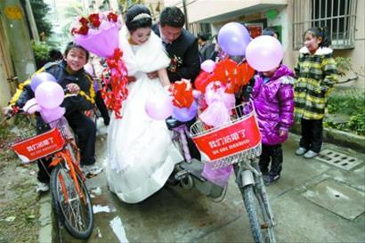 “四輪車人人結(jié)婚都會乘,兩個輪子的就少見了吧。 ”新郎孫軍說,現(xiàn)在政府提倡節(jié)能以保護環(huán)境,用租賃自行車迎親,既響應(yīng)了政府號召,又降低了婚禮成本。并且這種形式與眾不同,非常有紀念意義。新郎新娘都姓孫,在同一家房地產(chǎn)公司工作,在商量婚事時,新娘希望能用一種別樣的方式來紀念他們的特殊緣分,于是這個自行車迎親方案立即得到了大家的青睞,“很特別,能讓人記一輩子”,新娘笑著說。