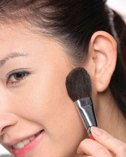 腮紅方面選用橘色腮紅,少量使用,制造出健康感的肌膚狀態(tài)。制造小臉效果在裸妝里同樣不能省略,只是在顏色選擇上,盡可能選擇自然的色調(diào),千萬不要因?yàn)樨潏D更大的縮臉效果,就選擇深色的修容粉。將修容粉沿著發(fā)際到下頜的位置輕輕掃上去,是由外向內(nèi),靠近耳根的顏色最深。注意腮紅和陰影的銜接要自然過渡。