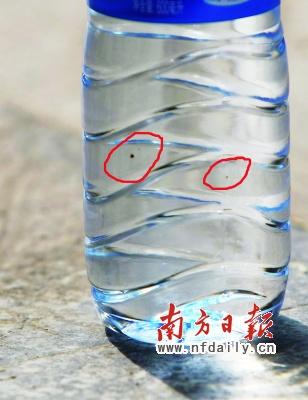 上周四,王先生兩名同事前來串門,飲用這箱益力礦泉水,發(fā)現(xiàn)瓶里漂著一片小指甲大小的黑色雜質。