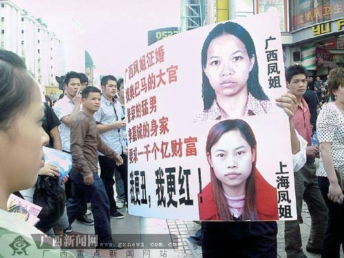 “找奧巴馬的大官、普京的猛男、李嘉誠的身價、要求一千個億財富……”4月11日下午,一男子在南寧市裕豐商廈門前,舉出“廣西鳳姐征婚”的廣告牌,聲稱要為自己的一位親戚——“廣西版鳳姐”征婚。當(dāng)天在現(xiàn)場,所謂的“廣西鳳姐”故作神秘沒現(xiàn)身,但其開出的征婚條件卻“雷倒”了眾多圍觀市民。這也引起了一些好奇市民的猜想和質(zhì)疑:“廣西鳳姐”是不是想學(xué)新近的“網(wǎng)絡(luò)紅人”——羅玉鳳(“鳳姐”)來出名?
