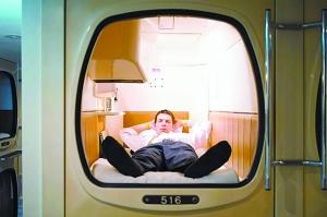 膠囊旅館的面積通常不會超過2平方米,高度僅有1.25米,人在里面無法站立,只能爬著進(jìn)去。一床、一桌、一臺電視,基本就是膠囊旅館的全部家具了。墻壁上有一排電子開關(guān),用于控制燈光、溫度和音響設(shè)備。