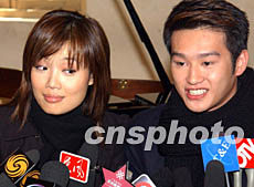 香港著名歌星容祖兒、2002年新秀冠軍吳浩康一月十日在香港為新歌《他都不愛我》拍攝MTV。圖為容祖兒、吳浩康接受記者采訪。錢興強(qiáng) 攝