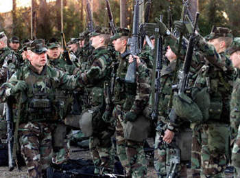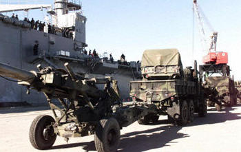 美國五角大樓發(fā)出增援海灣命令后,海軍陸戰(zhàn)隊(duì)奉命從杰克遜維爾海軍陸戰(zhàn)隊(duì)基地出發(fā)。在北卡羅萊納國家港口待命的美艦龐賽號負(fù)責(zé)運(yùn)載炮兵重型裝備。