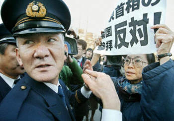 一位日本婦女在靖國(guó)神社門前手持抗議標(biāo)語(yǔ),反對(duì)首相小泉純一郎參拜。