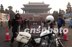 十五日,一位交警正在北京故宮神武門廣場執(zhí)勤。從當(dāng)天開始,神武門外停車場被取消。故宮博物院的通告說,此舉是為了恢復(fù)紫禁城周邊凝重幽靜的壯美景觀。作者:張煒