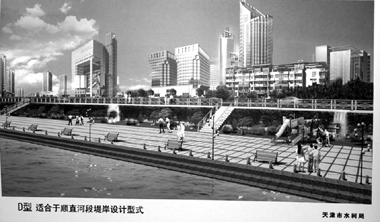 為了達(dá)到良好的觀水效果,規(guī)劃海河兩岸原則上不設(shè)獨(dú)立防洪墻,根據(jù)不同地段的地形、地貌及開發(fā)建設(shè)要求,在不影響外觀及功能的前提下,采用建筑物底層外墻結(jié)合防洪要求,或在不影響交通的前提下,局部抬高路面或設(shè)置觀水平臺(tái),并通過現(xiàn)代化防洪調(diào)度、分流等措施,確保城市防洪、排瀝安全。