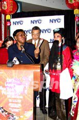 美國亞美商業(yè)發(fā)展中心邀請紐約市旅游局共同舉辦中國農(nóng)歷羊年新春慶;顒印R辉率,主辦者在曼哈頓中城舉行記者會,亞美商業(yè)發(fā)展中心總裁王章華(中)介紹帝國大廈亮燈慶祝以及紐約華埠即將舉行的多項(xiàng)活動。曼哈頓區(qū)區(qū)長費(fèi)絲(左)特意前來祝賀,她拿著剛剛出版的《華埠旅游指南》愛不釋手,希望慶;顒幽芡苿尤A埠和曼哈頓的經(jīng)濟(jì)復(fù)蘇。作者:趙海燕