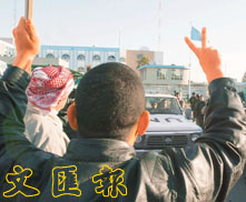 數百名伊拉克記者聚集在運河酒店門外,在一九九一年海灣戰(zhàn)爭周年舉行抗議活動。于海灣戰(zhàn)爭中,伊拉克部隊占領了科威特七個月后,被以美國為首的盟軍驅逐出科威特。