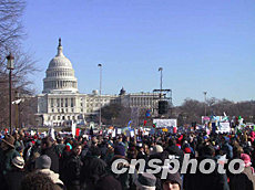 數(shù)萬美國人十八日中午聚集華盛頓的國會山前,舉行聲勢浩大的反戰(zhàn)示威游行,反對對伊拉克動(dòng)武。作者:余東暉