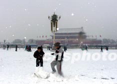 一月二十二日清晨,北京天安門廣場被昨夜一場大雪染成銀白世界,天真的小孩在雪地中玩得十分開心。作者:劉呈軍