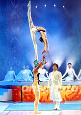 中國新秀魏葆華和吳正丹在北京春節(jié)晚會上表演雜技《梁祝·化蝶》,此節(jié)目曾經(jīng)獲得第二十六屆蒙特卡羅金小丑芭蕾舞金獎。作者:王新