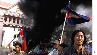 據(jù)BBC報(bào)道,縱火燒毀了泰國大使館后,約一千名示威者又攻擊了其他建筑。