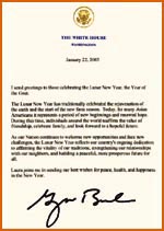 布什總統(tǒng)二十九日發(fā)布賀詞說(shuō),農(nóng)歷新年的傳統(tǒng)是慶祝大地復(fù)蘇和新的耕作時(shí)節(jié)的開(kāi)始。如今,對(duì)于許多美國(guó)亞裔來(lái)說(shuō),它標(biāo)示著新開(kāi)端和新希望的降臨。在這段時(shí)間里,世界各地的人們重新確認(rèn)友誼的價(jià)值,慶祝家庭團(tuán)圓,期待著一個(gè)充滿(mǎn)希望的未來(lái)!