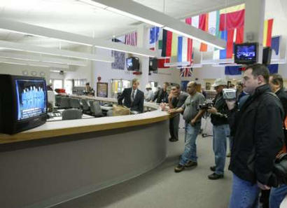 2月1日,記者們(右)在肯尼迪航天中心的新聞中心收聽有關航天飛機的最新消息