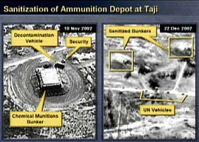 他說(shuō),伊拉克在核查員抵達(dá)前轉(zhuǎn)移了可疑的生化武器設(shè)備。他所提交的人造衛(wèi)星拍攝的照片,顯示伊拉克擁有“違禁材料”,他還播放電話錄音,顯示伊拉克軍官要求銷毀證據(jù)的對(duì)話和做假證以及關(guān)于毒氣的內(nèi)容。