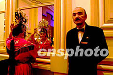 在美國芝加哥華人華僑春節(jié)聯(lián)歡會上,扮演楊貴妃的演員上場前整妝,與希爾頓酒店的洋服務生在羊年相遇,形成有趣的三“羊”相會。作者:王瑤