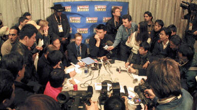當(dāng)?shù)貢r間2月7日,NBA全明星賽在亞特蘭大舉行記者招待會。姚明在記者會上回答來自全世界各國媒體記者的提問。文章說,在接受采訪的時候,眾多的攝像機(jī)都在等待著他的出現(xiàn),他出現(xiàn)后,全場鎂光燈頻閃,而為了讓他到桌前接受記者的提問,工作人員必須為他艱難的開辟一條路。