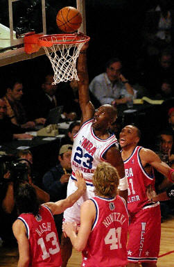 去年以狀元秀身份加盟休斯頓火箭隊(duì)的中國(guó)球員姚明,以首發(fā)身份為西部聯(lián)盟全明星隊(duì)出戰(zhàn)。比賽剛開(kāi)始,姚明就接到隊(duì)友傳球,扣籃成功,為球隊(duì)貢獻(xiàn)兩分。在上半場(chǎng),姚明上場(chǎng)10分鐘,1投1中,2個(gè)籃板球,2分。
