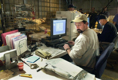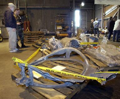 10日,美國(guó)洛杉機(jī)巴科斯德勒空軍基地,哥倫比亞號(hào)聯(lián)合調(diào)查組人員對(duì)收集來(lái)的殘骸進(jìn)行分析比對(duì),試圖找出哥倫比亞航天飛機(jī)失事的原因。