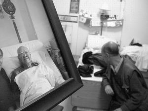 協(xié)和醫(yī)院A級二病房里袁先生病床的床頭上還掛著兩排醒目的賀年卡,其中一張寫著“早日康復,壽比南山”的卡片是袁先生兒子袁偉承寄來的。病床邊上的病歷本詳細記錄著袁先生住院期間每天的病況。在病房里,還放著一張袁先生在病中與兒子袁偉承的大合影,照片上的袁先生笑得很燦爛。