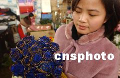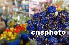 1月13日,鄭州陳寨花卉市場,金邊藍(lán)色玫瑰(藍(lán)色妖姬)售出天價(jià),每枝賣出380元的高價(jià),由于商家進(jìn)貨不多,而且只有一、兩家經(jīng)銷商有貨,據(jù)經(jīng)營者介紹,銷售還不錯(cuò)。馬健 攝