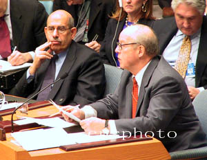 聯(lián)合國監(jiān)測、核查和視察委員會主席布利克斯(右)和國際原子能機(jī)構(gòu)總干事巴拉迪(左)二月十四日上午再次向聯(lián)合國安理會提交核查報告。(作者:趙海燕)