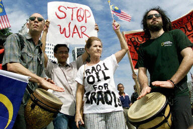 而在亞洲及澳洲,一些國家今日已展開反戰(zhàn)示威游行,泰國、馬來西亞及新西蘭等國均有示威活動。在泰國有大約3000人上街示威,高喊反戰(zhàn)口號,而新西蘭有數(shù)以萬計的示威者走上上街頭反對美對伊開戰(zhàn)。