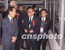 國務(wù)院副總理錢其琛(左一)、全國政協(xié)副主席羅豪才(左二),十五日在泉州饒有興致地觀看二十世紀(jì)華僑華人圖片展。作者:劉可耕