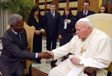 抵達羅馬參加聯(lián)合國發(fā)展署有關(guān)會議的聯(lián)合國秘書長安南與羅馬天主教皇約翰保羅二世舉行了長達30分鐘的會談。