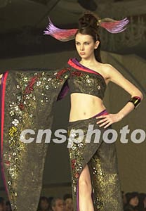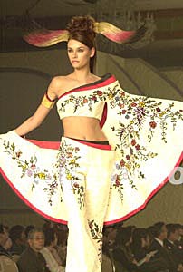 日本著名時裝設(shè)計師桂由美(Yumi Katsura)大膽采用和紙、竹工等日本傳統(tǒng)工藝,作出新穎的時裝,十八日在東京展示的和服借用了和紙剪繪的工藝技術(shù)。作者:陶光雄
