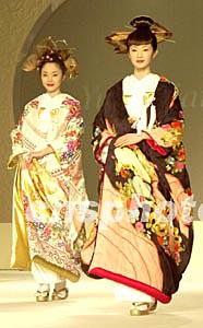 日本著名時裝設(shè)計師桂由美(Yumi Katsura)十八日在東京展示了她的最新作品。日本和服以穿著復(fù)雜、行動困難而著稱,而桂由美在保持傳統(tǒng)美的基礎(chǔ)上,對和服進行“易穿、易動、輕量”等時裝化改良。作者:陶光雄