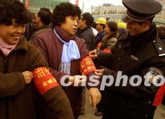 北京市東城警方二十四日舉行“警民聯(lián)防保安全”大會,發(fā)動群眾協(xié)助警方做好“兩會”安全保衛(wèi)工作。目前北京市已有四萬多名“紅袖標(biāo)”在街道、社區(qū)巡邏值勤。作者:宋吉河