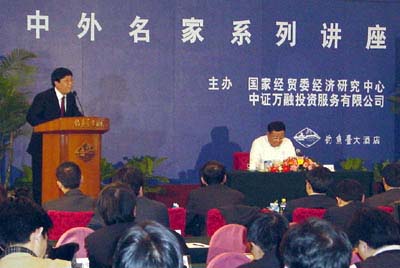 據(jù)了解,“中外名家系列講座”是由國家經(jīng)貿(mào)委經(jīng)濟研究中心和中證萬融投資服務(wù)有限公司聯(lián)合主辦。自2001年9月起已舉辦了37期(每月2期),受到社會各界特別是企業(yè)界的廣泛好評。參加此期講座的嘉賓中,有來自企業(yè)界的知名人士及各大媒體領(lǐng)導。此期講座由專項部主任支東升主持。