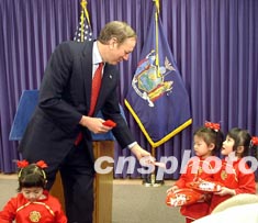紐約州州長柏塔基二月二十六日在其位于紐約曼哈頓中城的辦公室舉行儀式,向亞裔社區(qū)恭賀羊年新春。柏塔基按照華人的傳統(tǒng)習慣給前來表演助興的華裔兒童發(fā)“賀歲紅包”。作者:趙海燕